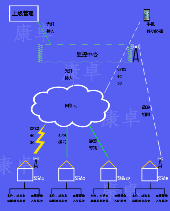3.無線網(wǎng)絡(luò)通信:各個泵站與監(jiān)控中心之間通過4G、3G、GPRS無線網(wǎng)絡(luò)通信,監(jiān)控中心與各職能部門之間通過局域網(wǎng)通信,該通信平臺不能傳輸連續(xù)圖像,此種傳輸方式要求各泵站有穩(wěn)定的4G、3G、GPRS信號,且監(jiān)控中心對視頻圖像要求不高。