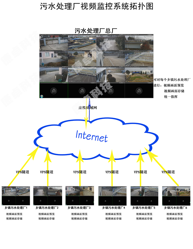 每個(gè)鄉(xiāng)鎮(zhèn)污水處理廠設(shè)計(jì)兩個(gè)監(jiān)控點(diǎn),分別采集污水處理廠進(jìn)出門(mén)處和全景畫(huà)面。每個(gè)鄉(xiāng)鎮(zhèn)進(jìn)行本地畫(huà)面存儲(chǔ),保證廠區(qū)內(nèi)人員、財(cái)產(chǎn)安全、設(shè)備正常使用。同時(shí)每個(gè)鄉(xiāng)鎮(zhèn)污水處理廠的畫(huà)面通過(guò)寬帶,建立虛擬局域網(wǎng)傳輸至總污水處理廠。總污水處理廠對(duì)每個(gè)鄉(xiāng)鎮(zhèn)污水處理廠進(jìn)行遠(yuǎn)程畫(huà)面存儲(chǔ)、預(yù)覽,結(jié)合自動(dòng)化系統(tǒng),統(tǒng)一協(xié)調(diào)指揮各個(gè)鄉(xiāng)鎮(zhèn)污水處理廠。