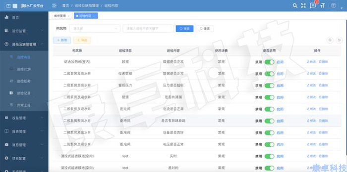 用戶可以自定義構(gòu)筑物與巡檢項目之間的關(guān)系,并任意增加修改巡檢項目,并支持臨時禁用此巡檢內(nèi)容。