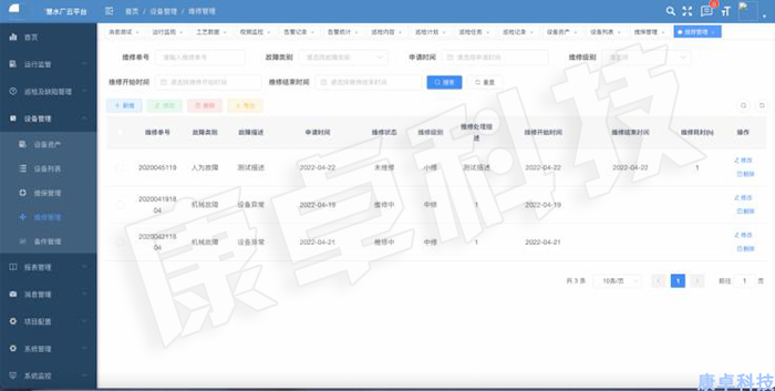 3、智慧運行:在污水生產(chǎn)運行中,對設(shè)備、儀表建立設(shè)備檔案,記錄運行時間,維護時間間隔,對污水生產(chǎn)過程中設(shè)備的維護與檢修做到安全標(biāo)準(zhǔn),并建立運營檔案。同時根據(jù)污水生產(chǎn)過程中儀表返回的數(shù)據(jù)進行分析,判斷相關(guān)設(shè)備的運行狀態(tài),做出預(yù)判,預(yù)警。智慧運行系統(tǒng)為污水生產(chǎn)提供安全保障。