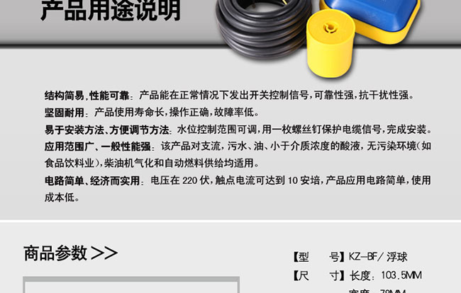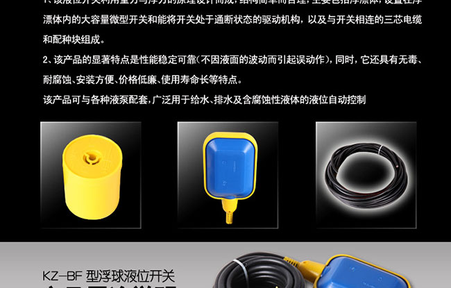 該產(chǎn)品可與各種液泵配套,廣泛用于給水、排水及含腐蝕性液體的液位自動(dòng)控制。