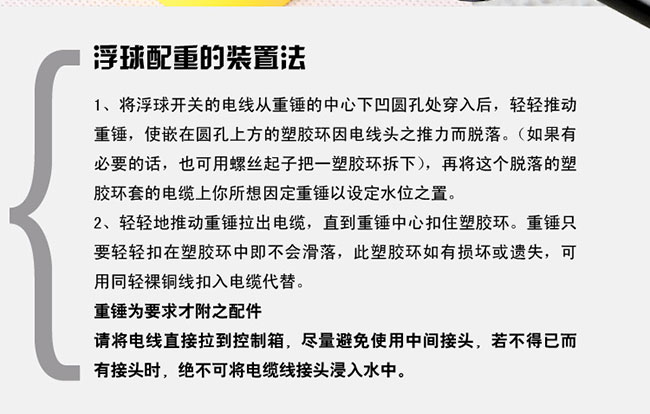1.將浮球開(kāi)關(guān)的電線從重錘的中心下凹圓孔處穿入后,輕輕推動(dòng)重錘,使嵌在圓孔上方的塑膠環(huán)因電線頭之推力而脫落。(如果有必要的話,也可用螺絲起子把一塑膠環(huán)拆下),再將這個(gè)脫落的塑膠環(huán)套的電纜上你所想因定重錘以設(shè)定水位之置。