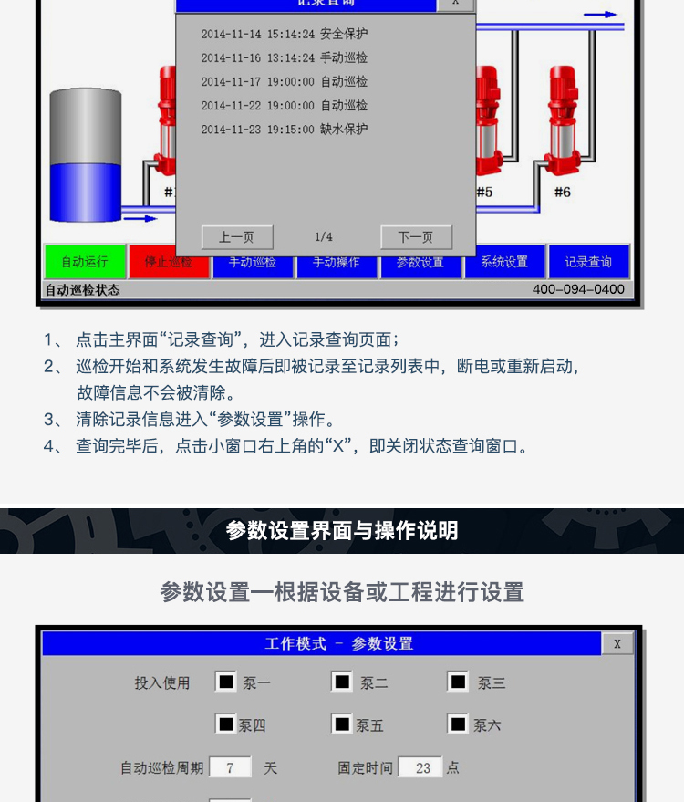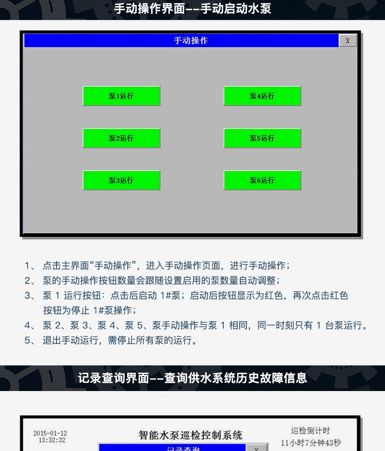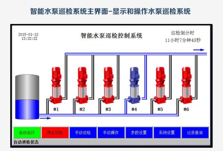 進(jìn)入自動(dòng)或者手動(dòng)巡檢后,1#泵和變頻器開始低頻巡檢,幾分鐘(具體值可在參數(shù)設(shè)置里設(shè)定)后,1#消防泵和變頻器停止。延時(shí)10秒后,2#消防泵開始啟動(dòng)巡檢,巡檢動(dòng)作與1#消防泵相同,以此類推,其他的消防泵巡檢過程相同。