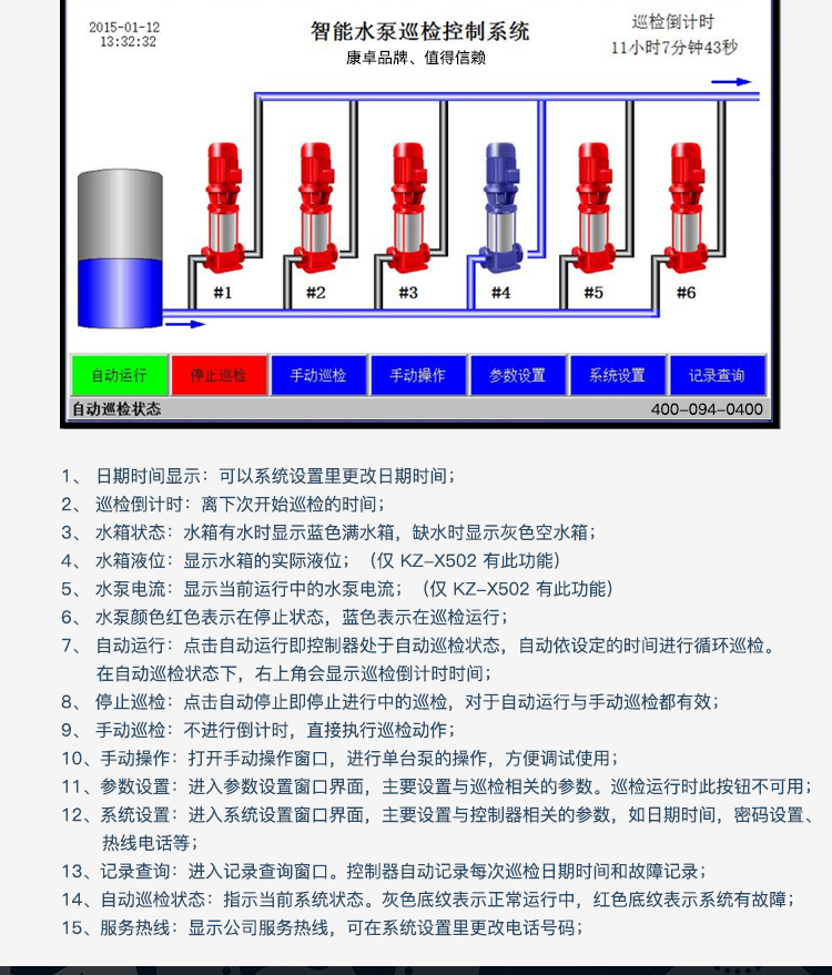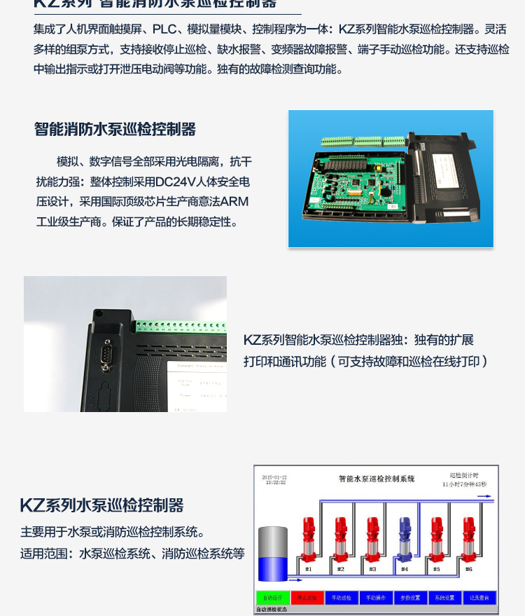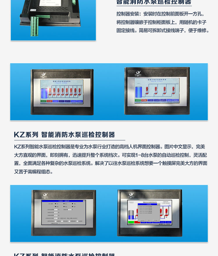 KZ系列消防巡檢控制器是專業(yè)為水泵行業(yè)打造的高檔人機(jī)界面控制器。圖片中文顯示,完善大方直觀的界面,即刻擁有,迅速提升整個(gè)系統(tǒng)檔次??蓪?shí)現(xiàn)1-8臺(tái)水泵的自動(dòng)巡檢控制,靈活配置,全面滿足各種復(fù)雜的水泵巡檢系統(tǒng)。解決了以往水泵巡檢系統(tǒng)想要一個(gè)觸摸屏完善大方的界面又苦于需編程組態(tài)。
