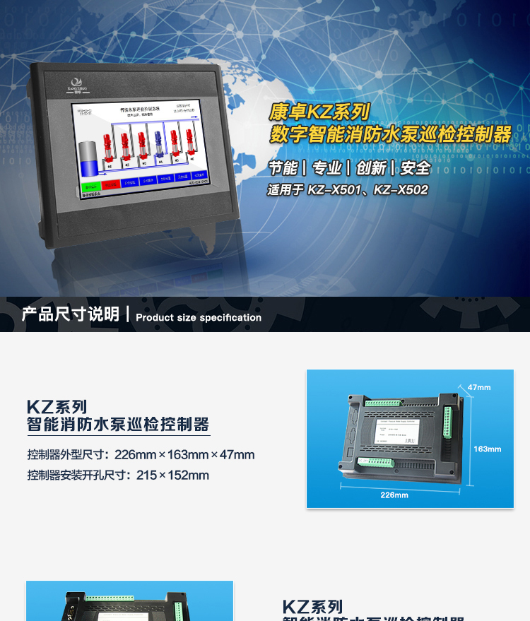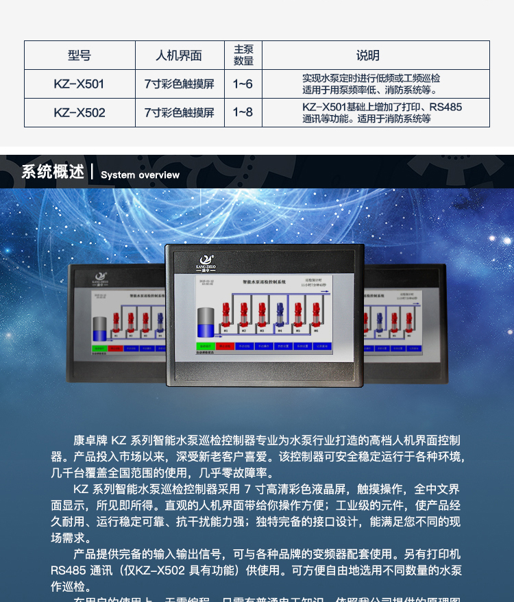 KZ-X502:主泵數(shù)量1-8;KZ-X501基礎(chǔ)上增加了打印、RS485通訊等功能。適用于消防系統(tǒng)等。