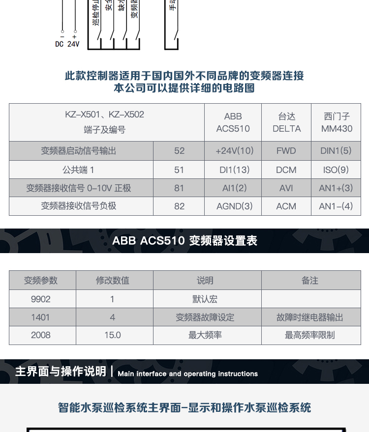 產(chǎn)品提供完備的輸入輸出信號,可與各種品牌的變頻器配套使用。另有打印機(jī)RS485通訊(僅KZ-X502具有功能)供使用??煞奖阕杂傻剡x用不同數(shù)量的水泵作巡檢。