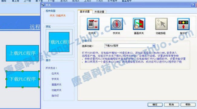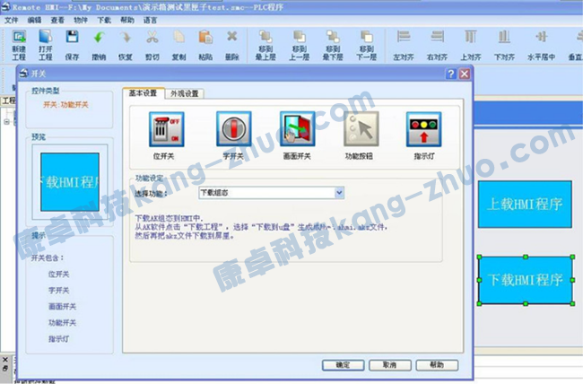 2、 在RemoteHMI,新建開關(guān)控件,關(guān)聯(lián)功能“下載PLC 程序”,如下圖: