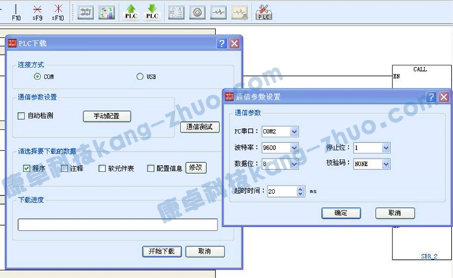 PLC 軟件里配置為COM2,通信測試正常,就可以下載PLC 程序了。上載PLC 也是一樣,通信建立后亦可對PLC 程序進(jìn)行在線監(jiān)控。