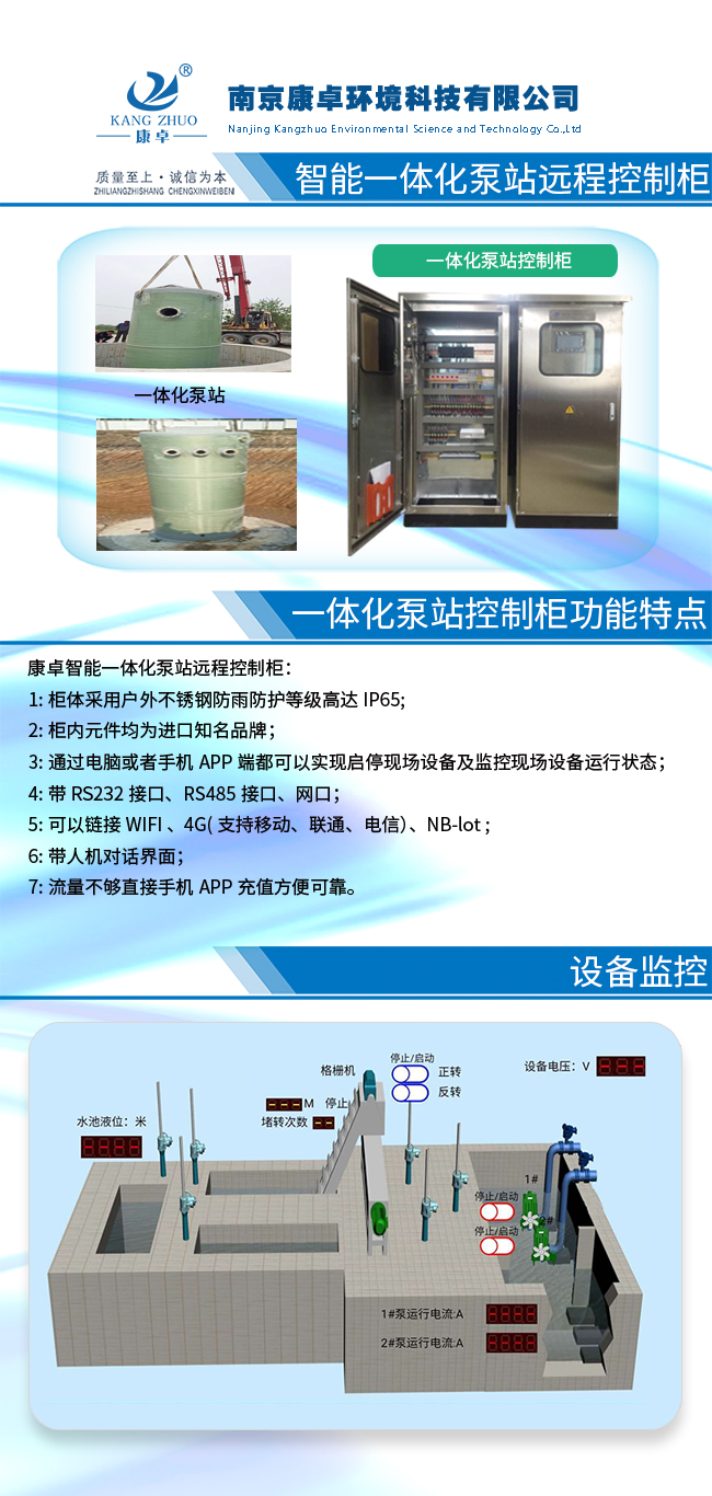 南京康卓環(huán)境科技有限公司所設(shè)計智能一體化泵站遠程控制柜,由調(diào)度中心、泵站監(jiān)控中心、通信平臺、泵站遠程測控終端、計量測量及攝像設(shè)備組成。在多個地區(qū)的各類型泵站建設(shè)有泵站自動化監(jiān)控系統(tǒng),該系統(tǒng)采用計算機控制,泵站操作人員只需在計算機前,用鼠標操作即可實現(xiàn)泵站內(nèi)各電氣設(shè)備的動作執(zhí)行和狀態(tài)反饋。