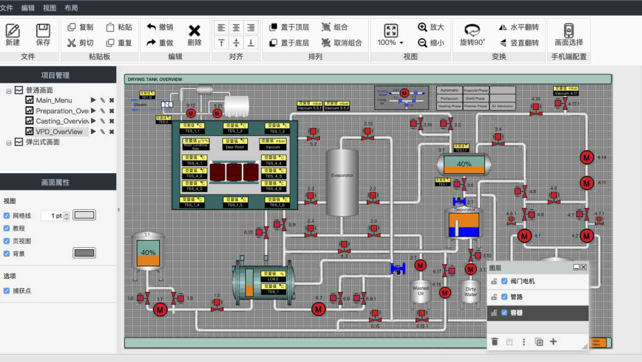 用戶可以根據(jù)自己的需求繪制監(jiān)控畫面,比如設(shè)備的監(jiān)控畫面、系統(tǒng)的工藝流程等,以較直觀的方式展現(xiàn)給用戶,無(wú)需安裝單獨(dú)的繪圖軟件,直接在瀏覽器端即可完成整個(gè)繪制工作。