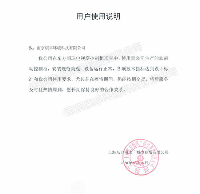 我公司在東方明珠電視塔控制柜項目中,使用貴公司生產(chǎn)的軟啟動控制柜,安裝規(guī)范美觀,設備運行正常,各項技術指標達到設計標準和我公司使用要求,尤其是在疫情期間,仍能按期交貨,售后服務及時且熱情周到,愿長期保持良好的合作關系。