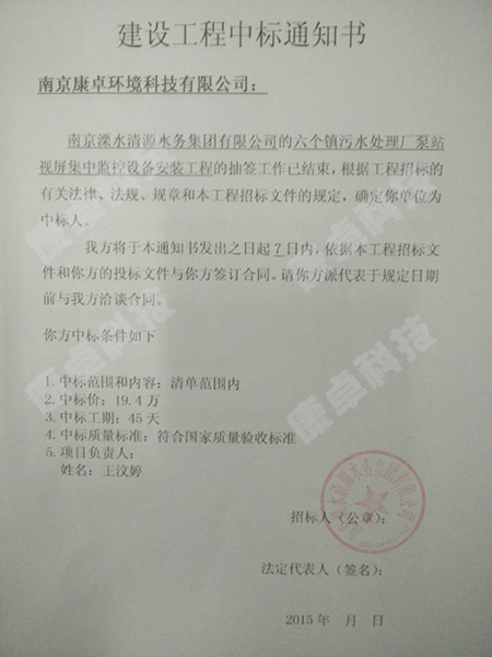 南京康卓環(huán)境科技有限公司)又傳來中標喜訊,收到南京溧水清源水務集團有限公司六個鎮(zhèn)污水處理廠泵站視屏集中監(jiān)控設備安裝工程的中標通知書,此次中標是對我公司的大力肯定。我公司將擬派一支技術精湛的施工隊伍,按照要求按時按質完成任務,為公司下一步的發(fā)展奠定良好的信譽基礎。