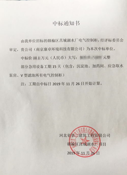 由我單位招標(biāo)的贛榆區(qū)莒城湖水廠電氣控制柜,經(jīng)評標(biāo)委員會審定,貴公司(南京康卓環(huán)境科技有限公司)為本次中標(biāo)單位。