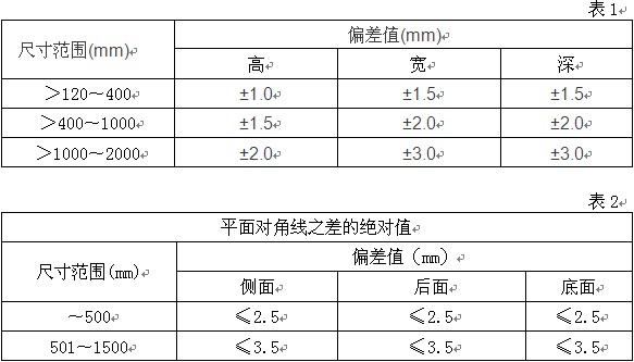 3、明裝箱體表面涂覆層輕微缺陷不得超出4處;暗裝箱體表面涂覆層輕微缺陷不得超出6處;箱體內(nèi)部輕微缺陷不得超出5處,堆積厚度不得超過8mm。