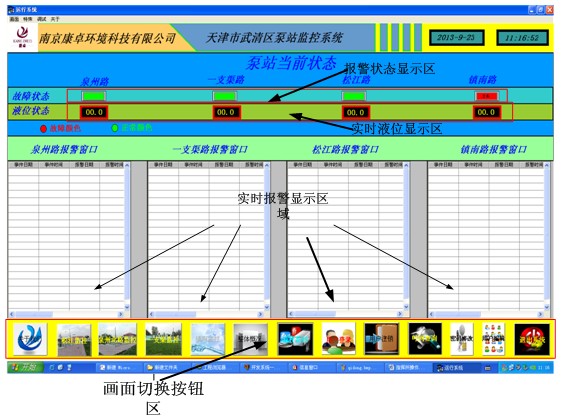 圖2中的畫面切換按鈕區(qū)會在大部分畫面中顯示,具體每個按鈕的功能將在后面介紹。實時報警顯示區(qū)顯示各個泵站的詳細報警信息。報警狀態(tài)顯示區(qū)指示報警狀態(tài),綠色為正常紅色為有報警產(chǎn)生。液位顯示區(qū)顯示每個泵站水池的液位深度,單位為“米”。