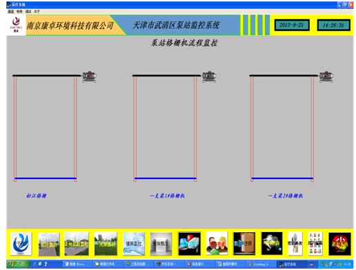 上圖為三個泵站的水泵及水池動畫流程圖,水池的藍色填充會隨著實際水位變化,水泵開啟時也會有水流動畫效果。水池側面為水位指示燈,當水位超過之前設置的水位時相應的指示燈會變?yōu)榧t色。點擊“格柵機流程”按鈕切換至格柵機動畫界面,如圖3所示: