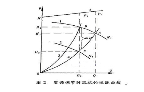 設(shè)A點(diǎn)為風(fēng)機(jī)較大工況點(diǎn)。當(dāng)風(fēng)量需從Q1減少到Q2時(shí),如果采用節(jié)流調(diào)節(jié)法,工況點(diǎn)由A到B,風(fēng)壓增加到H2,由圖中可看出軸功率P2下降,但減少的不太多。如果采用變頻調(diào)節(jié)方式,風(fēng)機(jī)工況點(diǎn)由A到C,可見在滿足同樣風(fēng)量Q2情況下,風(fēng)壓H3將大幅度下降,功率P3隨著顯著減少。節(jié)省的功率損耗△P=△HQ2與圖中面積BH2H3C成正比。