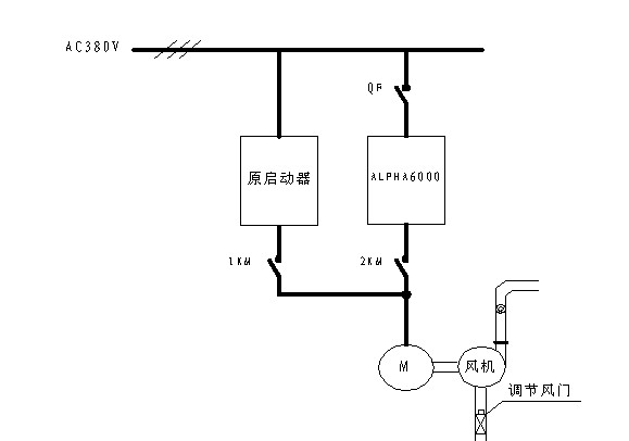 根據(jù)原設(shè)備工況,考慮可靠性及配置的靈活性,采用一拖一方案,每臺(tái)鼓風(fēng)機(jī)電機(jī)加裝一套變頻節(jié)能柜,保留原軟啟動(dòng)裝置,作為變頻控制柜故障時(shí)的備用裝置,以保證生產(chǎn)的萬(wàn)無(wú)一失。變頻控制柜內(nèi)含變頻器、切換接觸器、指示表、指示燈及按鈕開關(guān)等。系統(tǒng)圖如下: