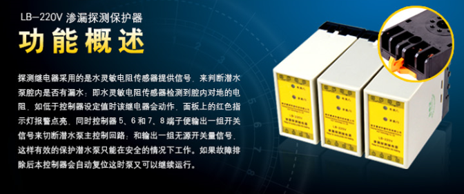 LB-220V水泵專用漏水保護器是專門用于檢測潛水泵內(nèi)水靈敏度的電阻。傳感器使用電極傳感器。當泵體內(nèi)出現(xiàn)漏水情況時,控制繼電器會發(fā)出相應(yīng)的控制信號,以便工作人員對水泵漏水進行處理。控制器在線路設(shè)計上采取了一系列的抗干擾措施,可以在電磁干擾十分嚴重的環(huán)境中可靠工作。