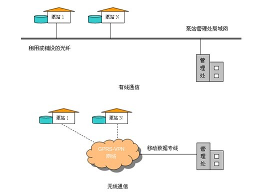 通信平臺(tái)常用兩種,一是有線通信:每個(gè)加壓泵站與管理處之間租用光纖通信,調(diào)度中心、泵站監(jiān)控中心、各職能部門(mén)之間通過(guò)局域網(wǎng)通信,該通信平臺(tái)可傳輸連續(xù)圖像。二是無(wú)線通信:每個(gè)加壓泵站與調(diào)度中心之間通過(guò)gprs無(wú)線網(wǎng)絡(luò)通信,調(diào)度中心、泵站監(jiān)控中心、各職能部門(mén)之間通過(guò)局域網(wǎng)通信,該通信平臺(tái)不能傳輸連續(xù)圖像。