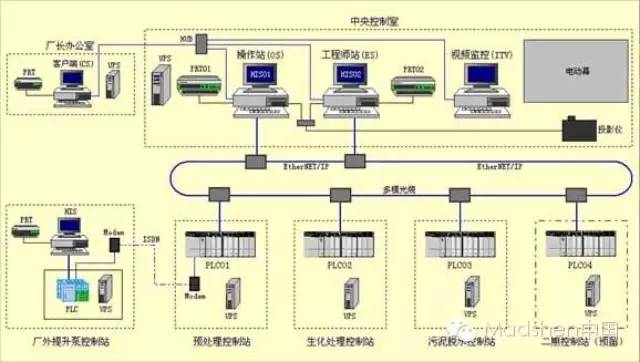根據(jù)污水提升泵站污水處理過程的流程和現(xiàn)場設(shè)備要求,整個污水泵站控制部分由電氣部分、PLC控制系統(tǒng)以及監(jiān)控系統(tǒng)組成的采用以太網(wǎng)和現(xiàn)場總線混合型結(jié)構(gòu)的集散型計算機控制系統(tǒng)。