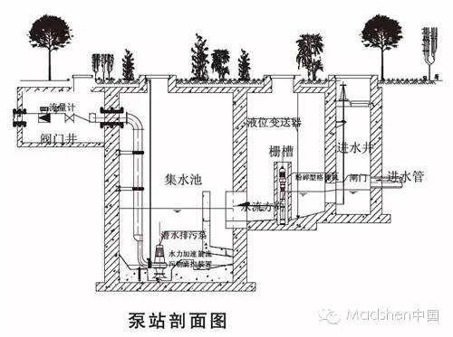 污水提升泵站一般由一用一備兩臺潛水泵組成,生活污水注入集水池內(nèi),當集水池內(nèi)水位升至設(shè)置的高水位時,一臺泵啟動,水位下降至設(shè)置的低水位時,泵自動停止工作。當集水池水位再次升至設(shè)置的高水位時,另外一臺水泵啟動,直至停止工作。