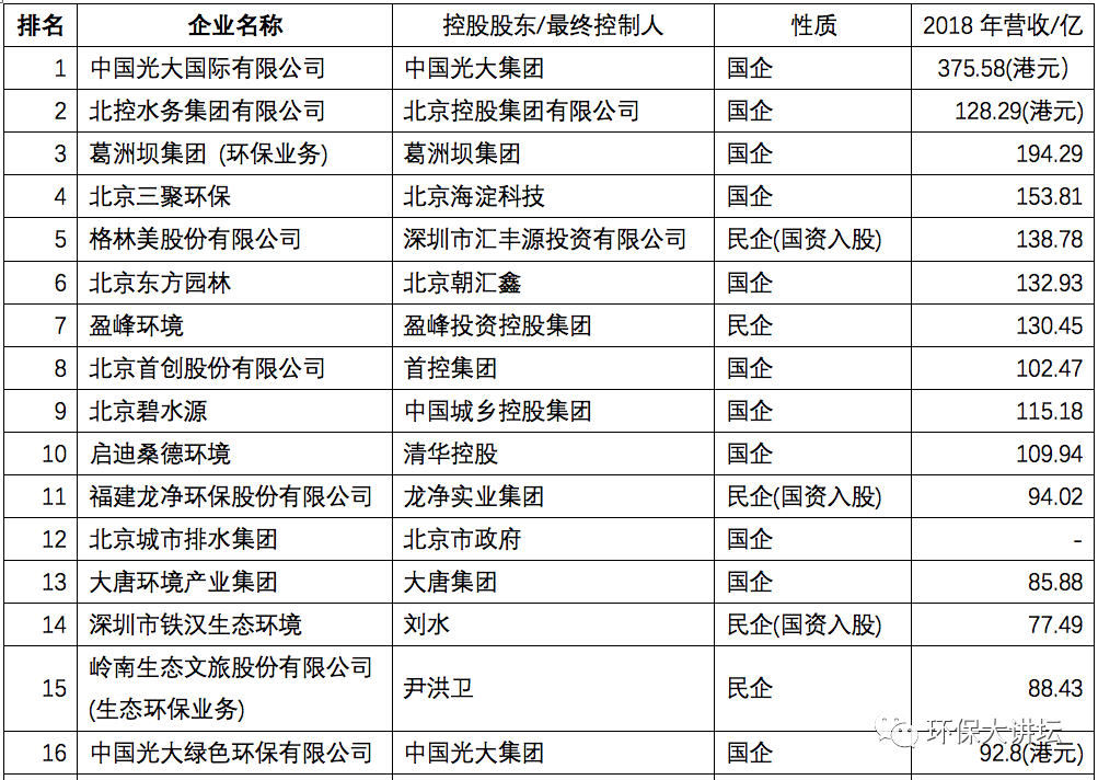 根據(jù)全國(guó)工商聯(lián)環(huán)境商會(huì)發(fā)布的《2019中國(guó)環(huán)境企業(yè)50強(qiáng)榜單》可以看出排名前10的環(huán)保企業(yè),民企僅1家,占比10%,8家為國(guó)企控股企業(yè),1家有國(guó)資入股企業(yè)。前10企業(yè)的2018年?duì)I業(yè)總額約為1581億。