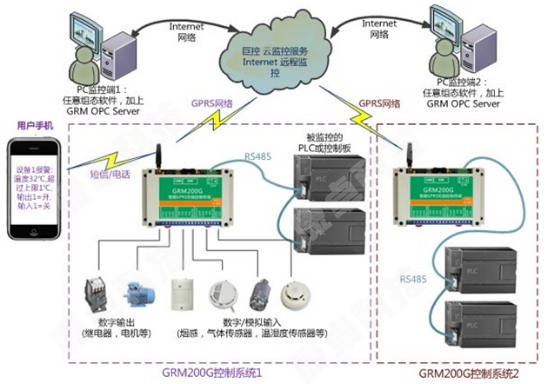 隨著GPRS技術(shù)的普遍應(yīng)用,應(yīng)用于PLC系統(tǒng)的第三方GPRS設(shè)備越來越多,使用方法也越來越簡便。PLC系統(tǒng)加入GPRS功能就好像給PLC裝上了一對翅膀,可以放置在任何一處條件許可的位置,而且可以遠程調(diào)試與監(jiān)控避免了工程師的來回奔波,省時省力。廣州巨控的GRM200G系列PLC專用GPRS模塊具備上述的的所有功能,利用GRM200G組成的系統(tǒng)如圖4所示: