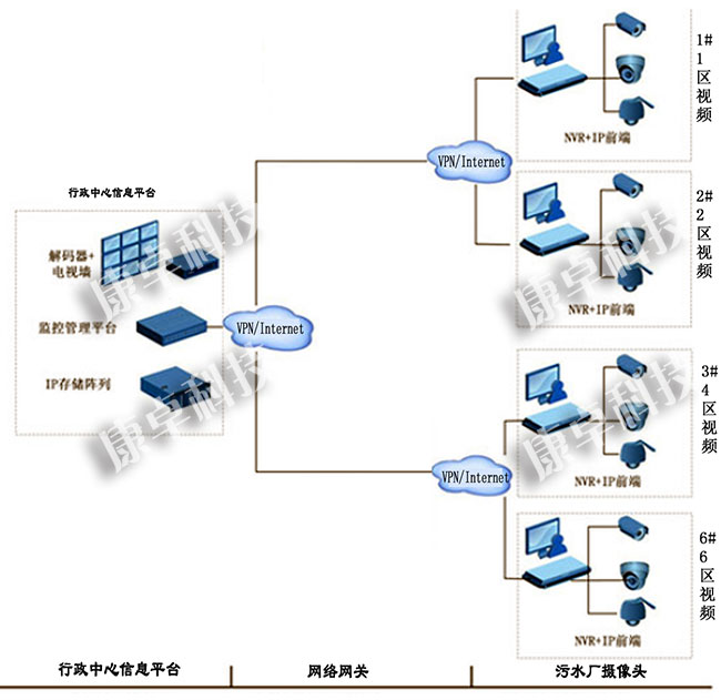 4、視頻監(jiān)控:在污水廠建立視頻監(jiān)控系統(tǒng),將視頻通過網(wǎng)絡(luò)傳輸至總信息平臺(tái),完成管理部門的視頻監(jiān)管。攝像頭采用一體化網(wǎng)絡(luò)攝像頭,帶夜視功能,圖像達(dá)到全高清畫質(zhì),現(xiàn)場與監(jiān)管平臺(tái)24小時(shí)不間斷視頻傳輸。