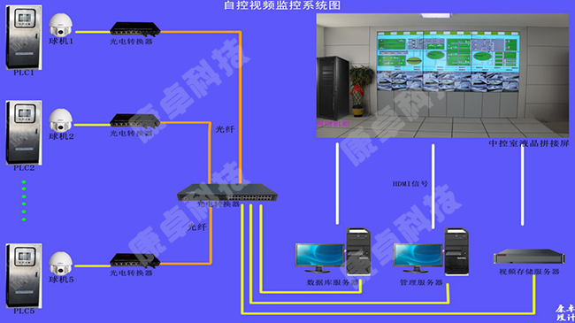 中央控制室是系統(tǒng)的監(jiān)控中心,在中央控制室足不出戶,即可對所有泵站進行數(shù)據(jù)監(jiān)測和控制管理。中控室配置專業(yè)的工控機,和一套3×4的液晶拼接屏。示意圖如下: