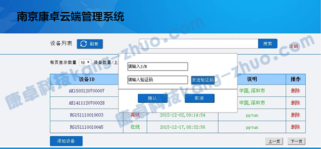 5、 登錄后,添加遠(yuǎn)程控制器(KZ-HMI 則是背后的SN 序列號)的 SN,一般遠(yuǎn)程控制器正上部會貼有“RG+12 位數(shù)字”,輸入后,在遠(yuǎn)程控制器上插入 U 盤,點擊獲取驗證碼,正常情況下,會聽到“滴”的一聲,說明獲取驗證碼成功,拔出U 盤,插入電腦,打開U 盤里“SecurityCode.txt”文件,提取驗證碼,輸入到瀏覽器,確定添加設(shè)備成功,如下圖: