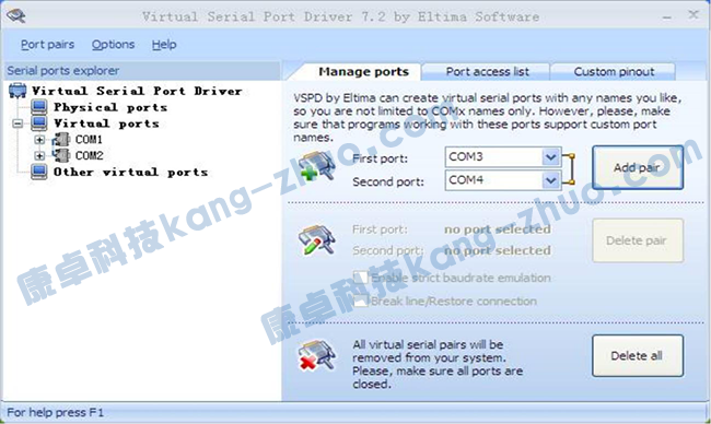 Add pair 添加配置了一組虛擬串口,案例中添加了COM1,2