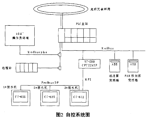 以康卓科技施工的某水廠污水處理系統(tǒng)為例,其結(jié)構(gòu)如下:系統(tǒng)設(shè)一PLC主站和遠(yuǎn)程10子站,采用施耐德Quantum系列PLC,現(xiàn)場(chǎng)設(shè)操作員站負(fù)責(zé)所有設(shè)備的監(jiān)控。PLC主站通過光纖冗余MB+環(huán)網(wǎng)連接至控制主網(wǎng)。PLC主站、遠(yuǎn)程IO子站以及現(xiàn)場(chǎng)單元之間通過MB+協(xié)議實(shí)現(xiàn)通訊,如圖2所示。